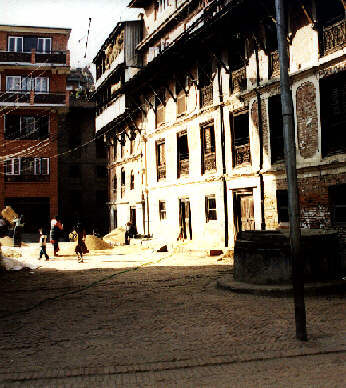 「バクタプルの路地で遊ぶ子供たち」